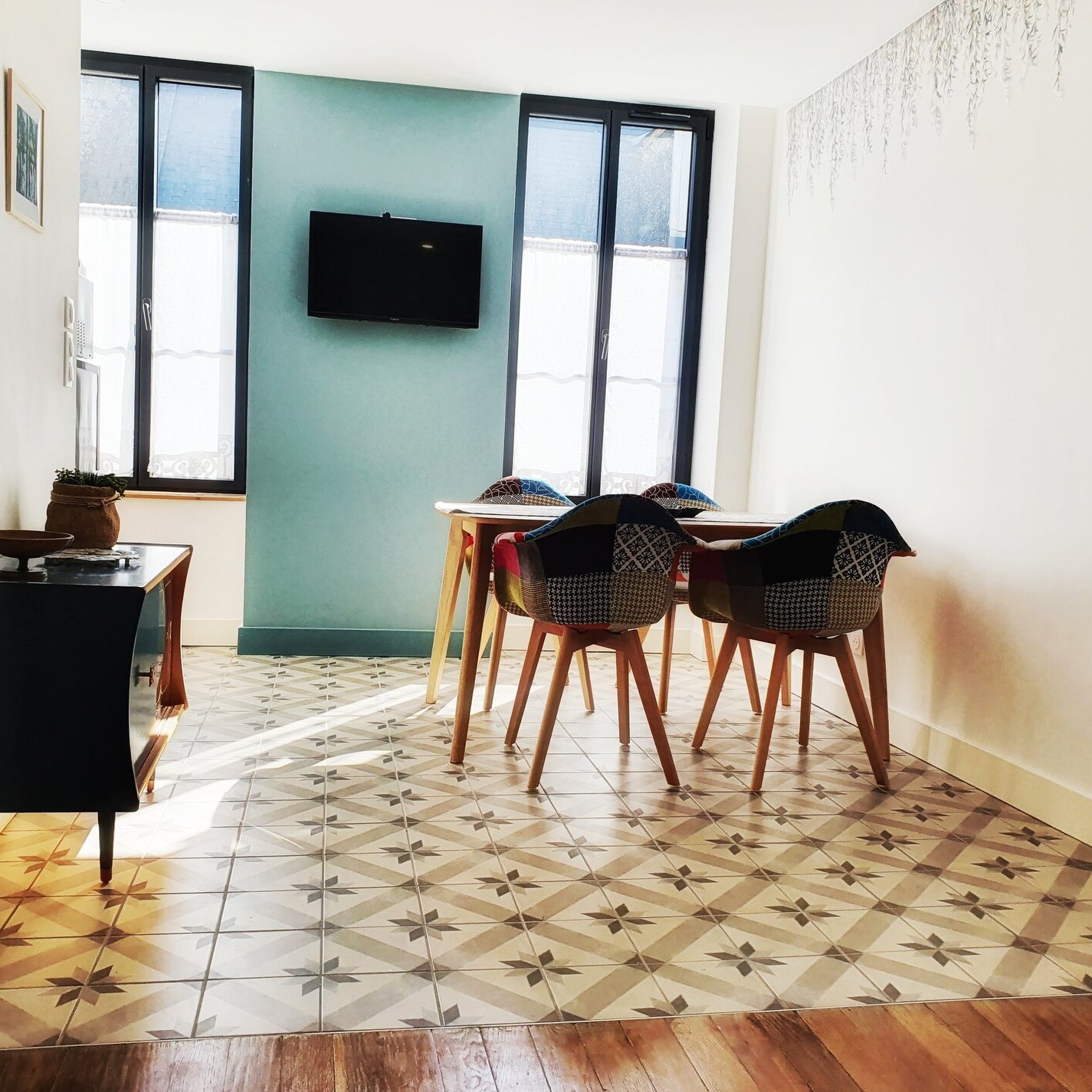 Appartement de qualité, 2 pièces au 1er étage. Une surface de 52m2 avec 2 salles de bain, totalement rénové en 2022. L’appartement, prévu pour 4 personnes est calme et lumineux. Il se compose d’un studio équipé d’un canapé-convertible (140×200) grand confort avec salle de bains (douche à l’italienne, pommeau pluie, WC, radiateur sèche-serviette), d’une cuisine équipée avec lave-vaisselle, d’un espace-repas spacieux et d’un coin–salon très agréable. La chambre dispose d’un lit double (140×200) de qualité, d’un bureau et d’une 2ème salle de bain (douche à l’italienne, pommeau pluie, WC, radiateur sèche-serviette). Wifi câblé pour une meilleure connexion. Chauffage et climatisation individuels par pompe à chaleur. Isolation performante. Draps, serviettes de toilette, torchons, produits d’accueil et ménagers, fournis. Buanderie avec lave-linge et matériel de repassage disponibles au rez-de-chaussée. L’immeuble ne dispose pas d’ascenseur. Commerces, services, parking à proximité. Accueil cyclotouristes Loire à Vélo.