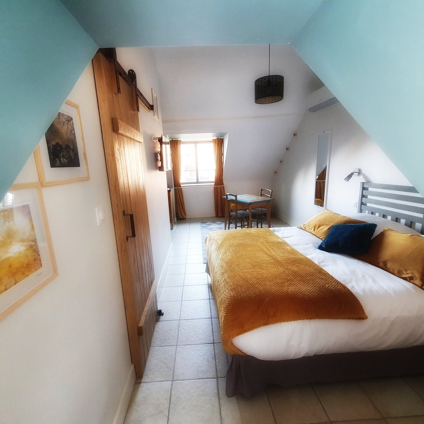 Studio de qualité calme et lumineux , situé au 2ème étage, d’une surface de 25m2 avec vue exceptionnelle sur les Remparts et l’Eglise Notre-Dame. Totalement rénové en 2022, le studio dispose d’un grand lit double de qualité, d’un espace-salon cosy, d’un espace-cuisine bien équipé, d’une salle de bain/wc avec douche à l’italienne et radiateur sèche-serviette électrique. Un soin particulier a été apporté à la décoration et au mobilier, jusqu’à la vaisselle, chinés pour la plupart. Les créations artistiques de la propriétaire, passionnée de nature, ornent les murs. Wifi câblé pour une meilleure connexion. Chauffage et climatisation individuels par pompe à chaleur. Isolation performante. Draps, serviettes de toilette, torchons, produits d’accueil et ménagers, fournis. Buanderie avec lave-linge et matériel de repassage disponibles au rez-de-chaussée. L’immeuble ne dispose pas d’ascenseur. Commerces, services, parking à proximité. Accueil cyclotouristes Loire à Vélo.